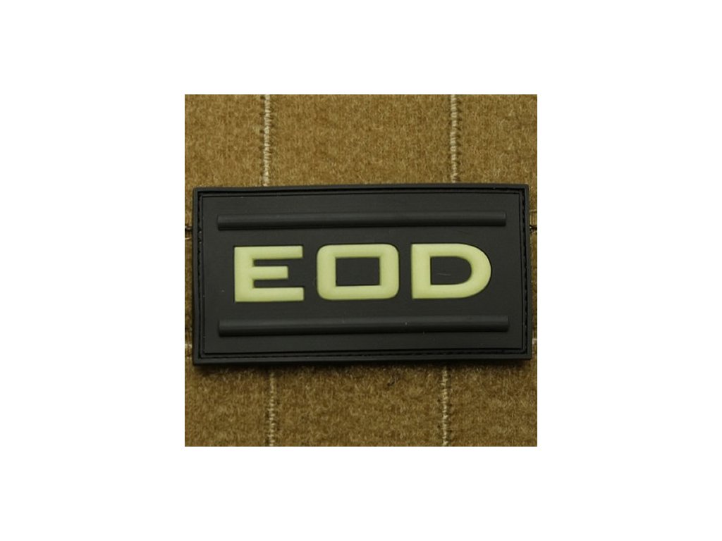 Plastová nášivka s nápisem EOD (Explosive Ordnance Disposal - pyrotechnik). Po nasvícení svítí ve tmě. Rozměr cca 7 x 4,5 cm.