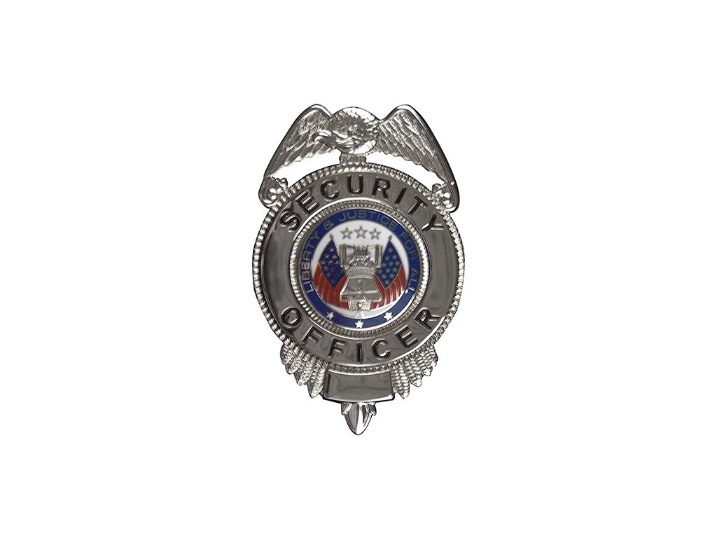 Kovový stříbrný odznak s nápisem SECURITY OFFICER. Barevné provedení. Výška cca 7cm.