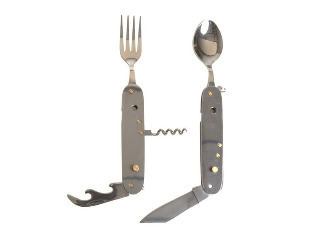 Skládací multifunkční nerezový příbor. Obsahuje: nůž, vidličku, lžíci, otvírák na konzervy a láhve, vývrtku,šídlo, kroužek pro připevnění na šňůrku. Dodáváno včetně pouzdra zlené barvy, lze připernit /provlečením/ na opasek.